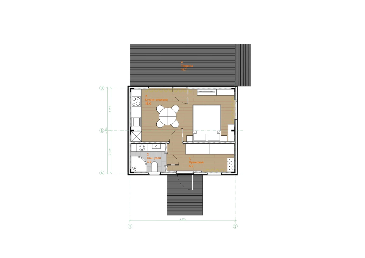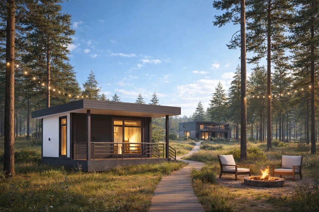 Домокомплект DOORHAN 44 ПРО — это компактное и продуманное пространство для одного человека или пары. Дом полностью функционален: отдельный санузел, кухня и зона отдыха. Благодаря оптимальному размеру он особенно популярен для глэмпингов и небольших проектов размещения. Также он отлично подходит как гостевой дом или дополнительный жилой блок на участке.