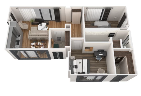 ULTRA 74 — это небольшой, но вместительный одноэтажный дом общей площадью 74 кв. м. Его планировочное решение предполагает наличие большой кухни-гостиной, санузла, гардероба, двух спален, одна из которых может служить детской или комнатой для гостей. Все помещения от холла до гостиной являются достаточно просторными, благодаря чему каждая комната может включать не только мебель и технику первой необходимости, но и любые предметы интерьера. Архитектура здания со смещением нескольких модулей позволяет организовать уютную открытую террасу рядом с входной группой.
